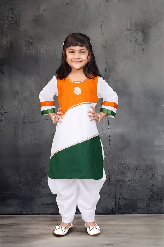 Add this sparkle kurta dhoti pant set to your daughter's wardrobe at this independence day and make it special for your child.your princess feel proud by wearing it.An affordable three colours girl's kurta dhoti pant with 3/4 sleeve yoke, round-neck, and this kurta dhoti pant set looks stylish and appealing.Made from cotton fabric, this dress is skin-friendly. This outfit is perfect for independence and republic day, and other special occasions like school event,national event Our dresses are comfortable and suitable for all seasons.