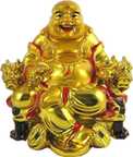 Saubhagya Global On Chair With Ingot And Money Coin Laughing Buddha For Health, Wealth & Prosperity Decorative Showpiece - 8 cm (Polyresin, Gold)
