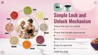 Courtesy of its thoughtful design, this chopper includes a safe lid-lock to enhance usability. Firstly, you can place the lock button in the unlock position, then press the handle down to the bottom position as shown in the guide. Once secure, move the button from unlock to lock. It is important to note that the lock does not operate when the handle is open, ensuring safety during use.