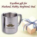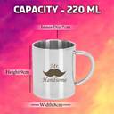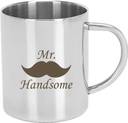 A steel mug has been with the phrase "Mr. Handsome" and an engraved mustache symbol. This suggests that the mug is a gift for a man who values his appearance and grooming. The use of the title "Mr." indicates that the recipient is likely a male, although it could also be a reference to a professional title. The mustache symbol adds a playful and stylish touch to the mug, highlighting the importance of grooming and self-care. The steel material of the mug suggests that it is a durable and long-lasting item, making it a practical gift option for daily use.Savri gifts - Mob. - 7987467071. Mail - savrigifts@gmail.com.Once you place an order simply mail us or WhatsApp us the details you want along with your Order ID.
