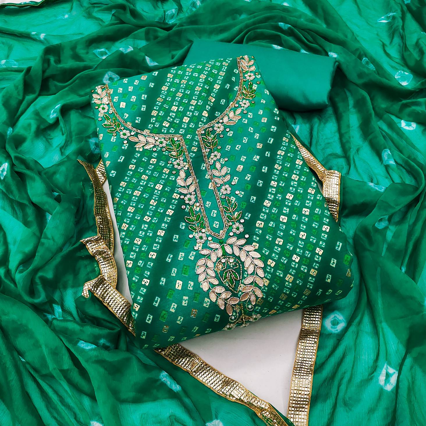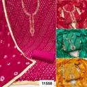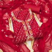 Top >>Jam Cotton Print With Embrodari Work (2.05 Mit) |Bottom >> Pure Cotton (2.50)Mit | Dupatta >> Nasmin Bandani Dupata(2.15 Mit)