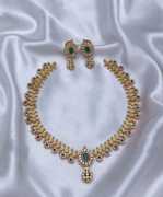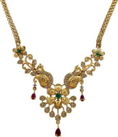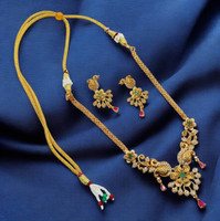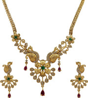 Displaying an eye-catching design, this jewellery set includes a necklace adorned with intricate peacock and floral motifs and finished in an antique-inspired style. The detailed artistry creates depth and visual interest, giving the piece a distinctive character. Additionally, carefully placed stone embellishments enhance the overall appearance, adding a refined decorative touch without appearing excessive. Therefore, this set achieves a harmonious balance between traditional detailing and elegant presentation.