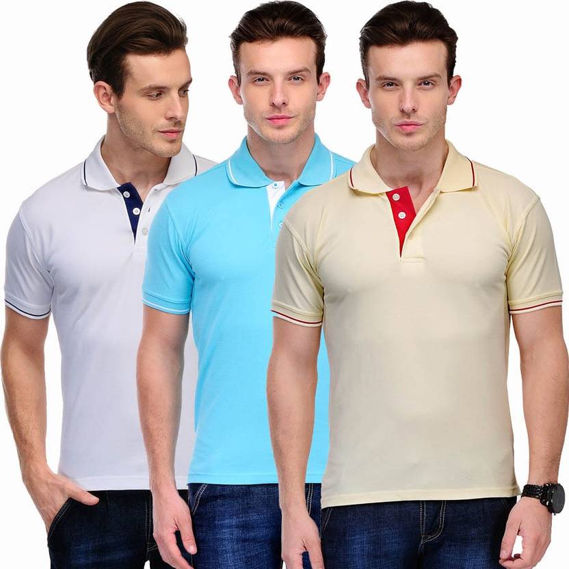 SCOTT INTERNATIONAL Pack of 3 Men Solid Polo Neck Cotton Blend Light Blue, White, Beige T-Shirt