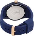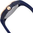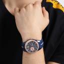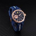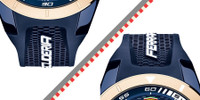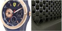 The watch design has a flowing, ergonomic shape from case to strap. The honeycomb texture, inspired by the grille of a race car and striking color combination of vibrant blue color and rose gold.