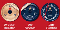 This multi-eye model features center-mounted hour, minute and seconds hands, and small day and date indicators with a small golden dial 24-hour hand. Case rim index for 60 seconds tracking.