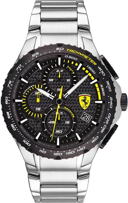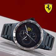 Pista is the new track-worthy family for the spring/summer 2020 season. The Pista embodies the sporty, high-energy characteristics of racing – featuring boldly colored cases, textured dials and sporty straps inspired by automotive design. The chronograph watches feature ion-plated or stainless-steel brushed cases, with two large knurl-textured pushers on either side of the scudetto-etched crown. The multi-dimensional dial design features floating stick markers and color accented sub-eyes, which sit above of the carbon-fiber-textured layer. The integrated silicone strap features perforations for a sporty look and comfort on the wrist. The unified leather and silicone strap features color accented stitching and perforations, reminiscent of the seats of a Ferrari sports car. Water resistant to 50 meters/5 ATM. 2-year limited international warranty.