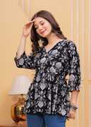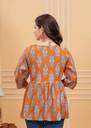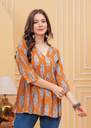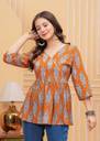 Elegance to your everyday wardrobe with this stylish orange printed peplum top. Designed with a flattering V-neckline and 3/4th sleeves, this top features a beautiful paisley-inspired print that brings out your ethnic charm with a modern twist. The cinched waist and flared hem enhance your silhouette, making it perfect for both casual outings and semi-formal events.