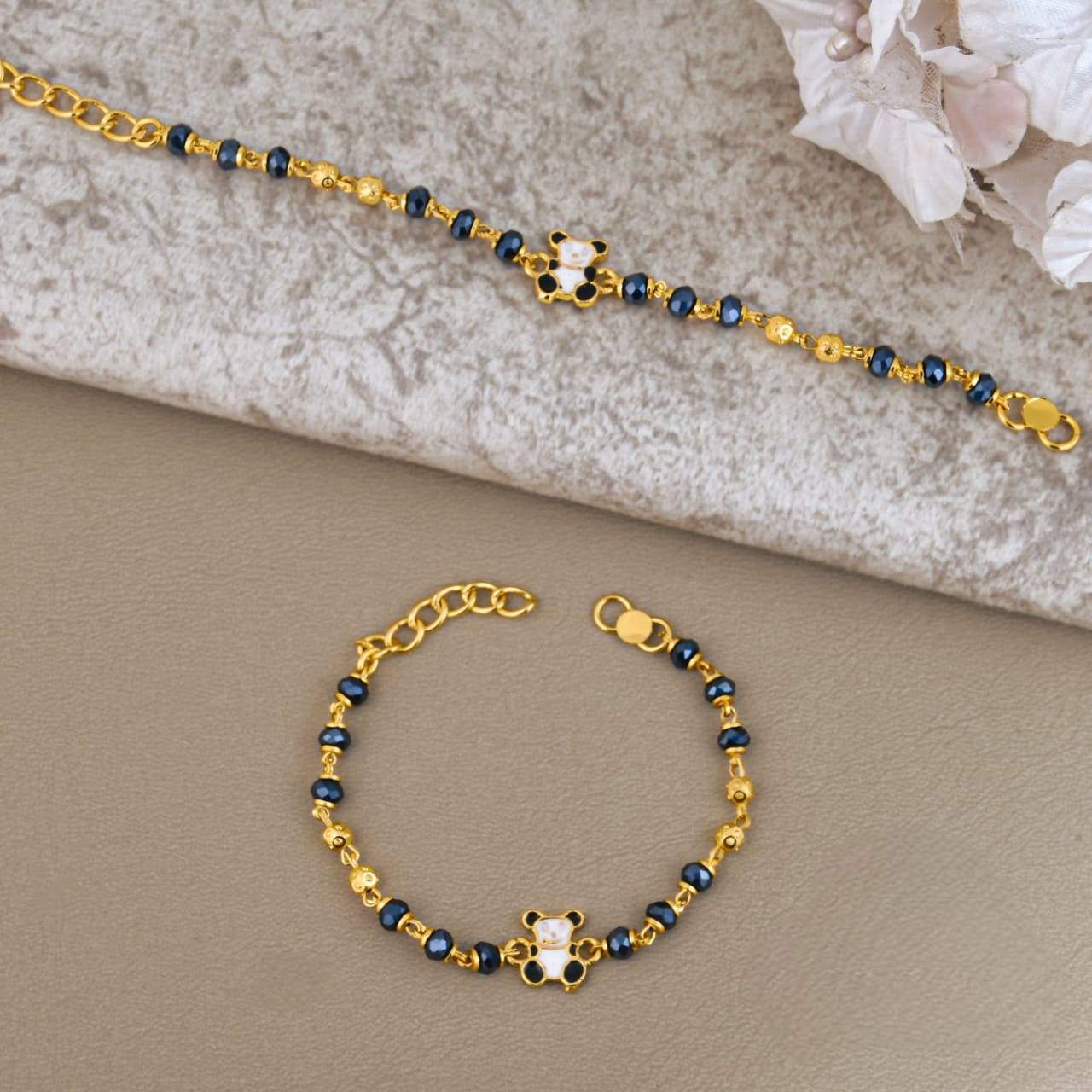This adorable baby nazariya bracelet with panda charm is designed especially for newborns and toddlers, combining tradition with everyday comfort. Made from high-quality brass gold plated material, it is skin-friendly, lightweight, and suitable for daily wear. The traditional baby najariya design adds a cute and meaningful touch while staying safe and comfortable for your little one.