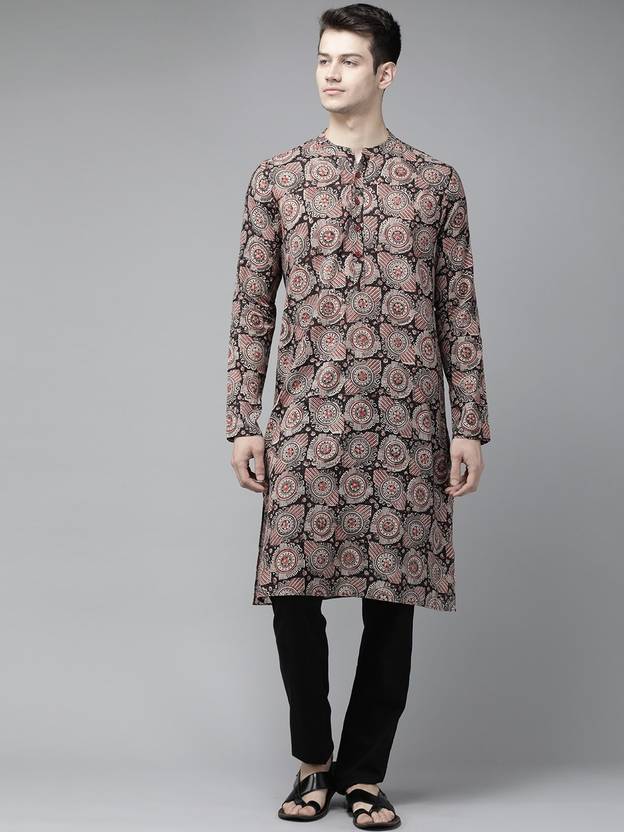 Men Kalamkari Pure Cotton Straight Kurta (Black, Beige)