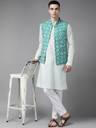Men Green & Beige Printed Pure Cotton Kurta Pajama With Neharu jacket With Blue Lining And Two Side Pocket One Chest pocket