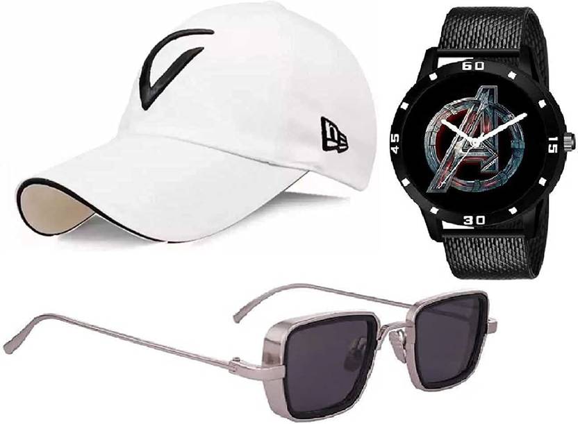 a Brand Black Analogue Silicon Steel Watch with Black Sunglass with basboll Cap White Combo of Boys and Kids Mans