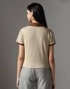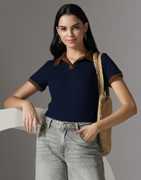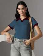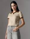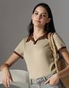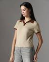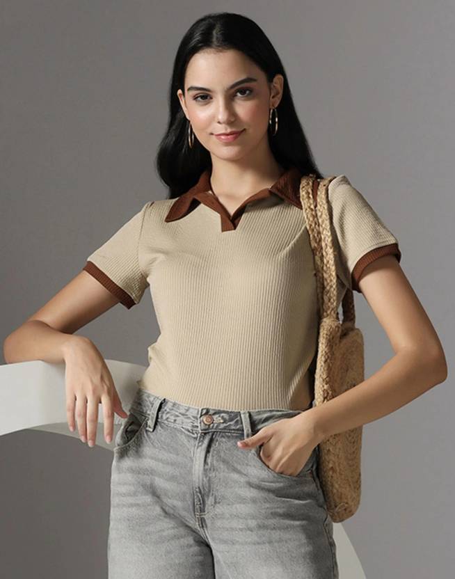 Upgrade your everyday casual style with this chic beige casual top by selvia. Designed with a contrast brown collar and sleeve hem, this top brings a smart and modern twist to your wardrobe. Crafted from soft ribbed lycra fabric, it ensures comfort and breathability all day long.while the straight hem and short regular sleeves make it a versatile pick for multiple occasions. Pair it with jeans, skirts, or trousers for a trendy yet effortless look.