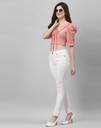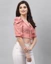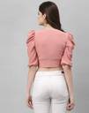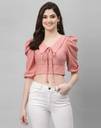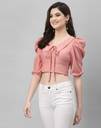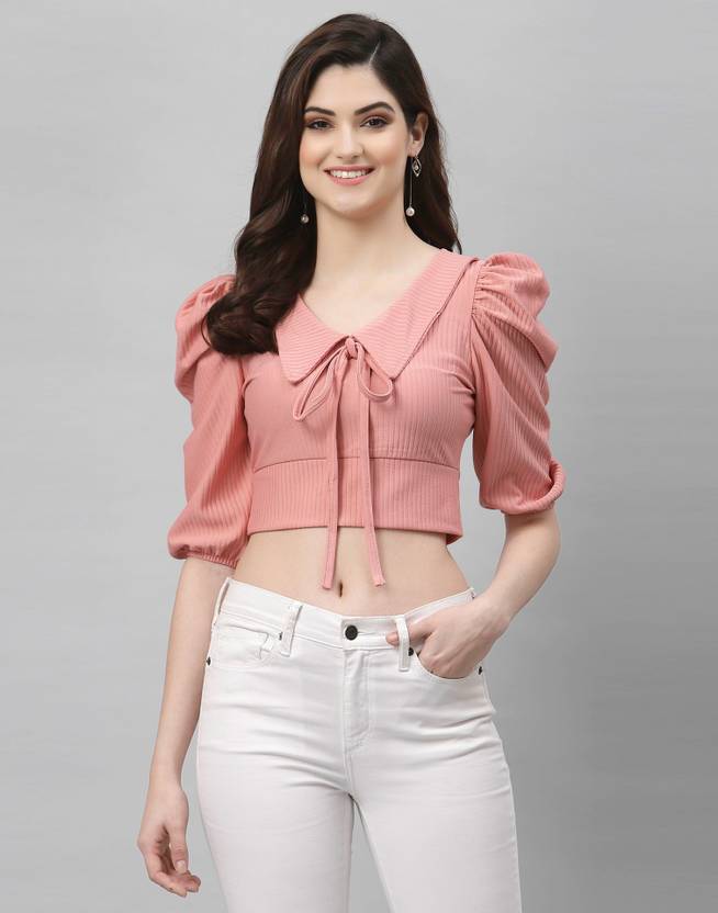 Light Pink Solid Knitted Crop Top, has a peter pan neck, knitted, balloon sleeve, knots & tie-ups closure, With this must-have top from Selvia, you can set your tone for the season. Style this light pink piece with a leather jacket and pumps for a chic date night look.