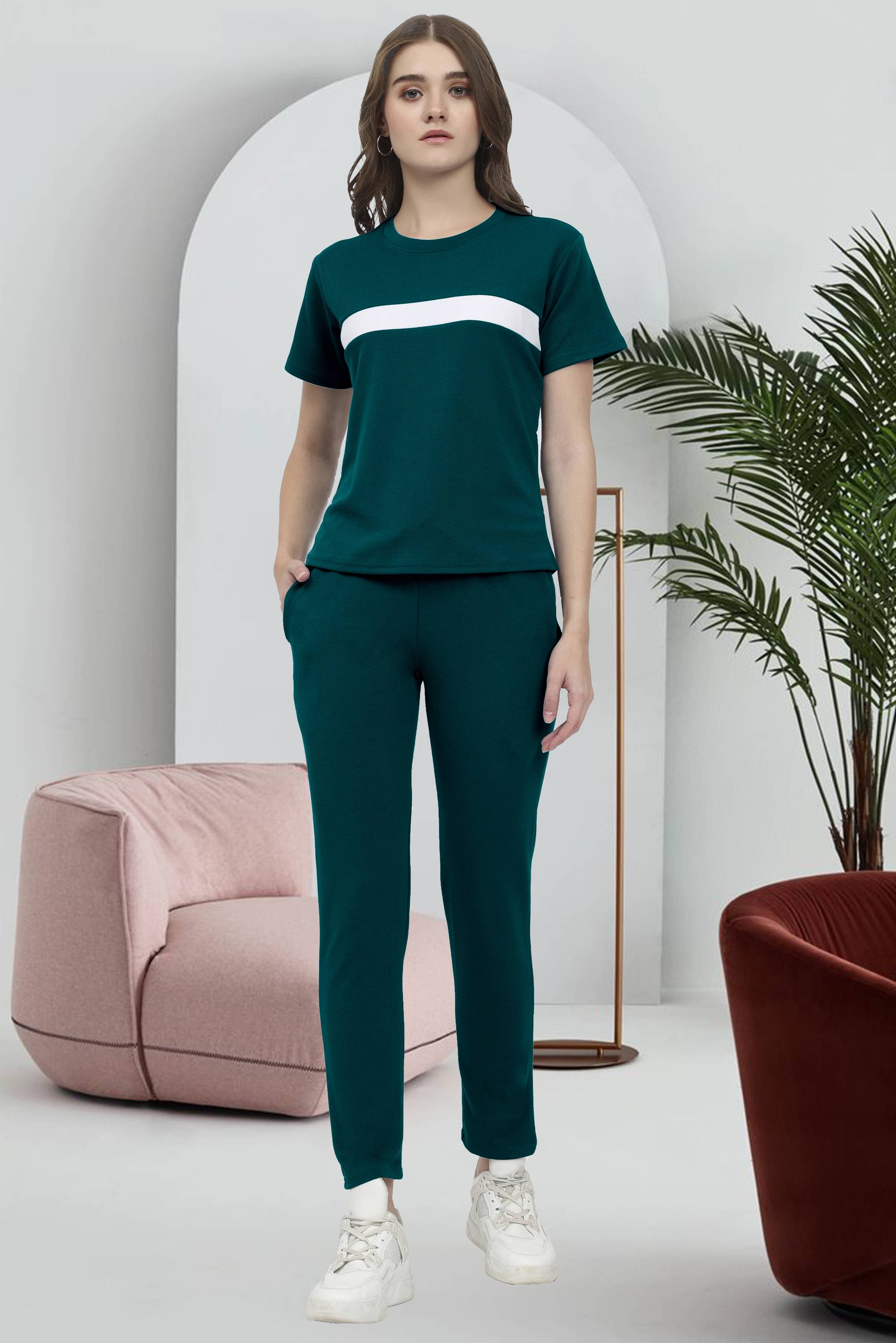 Elevate your casual wardrobe with this chic women's co-ords set crafted from comfortable lycra fabric. The top features a classic round neck and short sleeves, offering a sleek yet relaxed silhouette. The solid color design provides a timeless, versatile look, perfect for any occasion. The matching bottoms come with an elastic waistband for a flattering fit and effortless wear. This co-ords set combines style and comfort, making it a must-have for your everyday essentials.