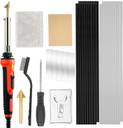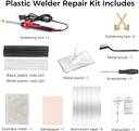 MULTIFUNCTION PLASTIC WELDER: Plastic welding kit with heating ceramic technology which quickly heat up to 350°C, easy to weld cracked/broken/teared plactic together. You can repair bumper kayak canoe vehicle dashboard or even fuel tank on an ATV. Plastic welder can also use for plastic tab and recycling bins repair. Repairs the plastic instead of buy new can save your money and reduce environmental pollution.EASY TO USE: Plastic repair welder is easy to operate. Clean the surface and prepare the tip and rods, heat up the welder tip and wait it rise the temperature, then paste the repairing. The welder handle with non-slip design is made of high temperature resistant material, safe and heat-insulated, no worry to hurt your hands.PROFESSIONAL REPAIR KIT: Plastic repair welder comes with high and low gears for quick or slow heating to repair different plastic materials. Plastic welding system can repair ABS, TPO, TEO, PP and most types of plastics. There is swith and indicator to distinguish between high and low gears which easy to confirm if it's hot, in case to hurt. All set plastic repair tools is enough for professionals and everyday use.WIDE APPLICATIONS: Our bumper crack welding kit is capable of handling various plastic surfaces, such as car bumper, dashboard, kayak, canoe, lamp holders, plastics rings, and daily plastics supplies. Additionally, the included soldering iron tip can also be used for electronic soldering repairs. Whether for household repairs or professional work, this plastic welder is up to your work.REPAIR KIT INCLUDES: Professional plastic welding repair kit includes 110V/100W plastic welder, 2 soldering tips, 40 weld rods(black x 20, white x 20), 1 stainless steel mesh, 1 sandpaper, 5 aluminum tape, 1 metal bracket, 1 metal brush, 1 screwdriver, 1 instruction.