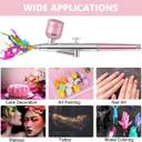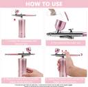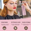COMPLETE PACKAGE: In addition to the rechargeable cordless airbrush compressor, this kit includes essential accessories for your convenience. It comes with a liquid extraction dropper, spray gun cleaner, wash needles, various capacity cups, a USB charging cable, a user manual, and a pink art airbrush gun. Get everything you need in one package meets your various needs.HIGH PRESSURE AIRBRUSH SPRAYER: This multi-purpose airbrush sprayer is crafted with premium aluminum alloy material working perfectly with compressed air source, ensuring a better and fine misting effect. No matter for applying skin toner or paint, this airbrush sprayer can transform the liquid into micro mist so as to give a even and delicate application on surface. USB rechargeable, built in rechargeable battery, can be powered by powerbank or connecting any power adapter.ENHANCED PERFORMANCE: Experience a higher air pressure and larger airflow with this airbrush kit. Compared to other similar airbrushes on the market, it offers a 50% increase in air pressure, reaching up to 20-27psi, and an airflow of 6-8L. The nozzle size of 0.3mm allows for precise spraying of watercolor pigments, inks, dyes, and properly diluted paint. Note: Acrylic paint should be diluted with distilled water or high-quality commercial thinners.EASY TO USE: This dual action airbrush features an auto-trigger function and a battery level display. Simply press the switch and trigger to start spraying air, and move the trigger back to spray liquid. You can easily control the amount of paint output. The airbrush gun stops working automatically after releasing the trigger. Compact and portable size makes the airbrush easy to carry and use anywhere.VERSATILE AIRBRUSH SPRAYER: This rechargeable cordless airbrush compressor is perfect for all your creative endeavors. With adjust air knob, you can easily control the spray flow for versatile needs. The lower pressure rating of 20PSI makes it ideal for airbrush gun makeup, while the higher pressure of 27PSI is perfect for airbrush painting, cake decoration, nail art, crafts, and more.