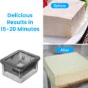 HIGH-QUALITY MATERIALS: The tofu press is made of food-grade PP material, ensuring both safety and durability. The heat resistance of this material allows for worry-free usage during the pressing process, even at high temperatures. Additionally, the durability of the tofu press ensures that it can withstand repeated use without compromising its functionality or longevity.SAFE AND RELIABLE: This non-toxic material ensures that no harmful substances will contaminate the tofu during the pressing process. This feature provides peace of mind, knowing that the tofu press is a trustworthy and reliable tool in your kitchen, prioritizing the safety of your food.EFFICIENT WATER REMOVAL: The tofu press is specifically designed to efficiently remove excessive water from tofu, resulting in a firmer texture. By effectively draining the water, the tofu will have a better consistency for various cooking methods, such as frying, grilling, or incorporating it in salads or stir-fries. Moreover, the transparent design makes it is more easier to monitor the tofu to achieve the desired firmness, allowing for better taste and texture in your dishes.MUST HAVE TOFU MAKING TOOL: The tofu press is an essential tool in homemade tofu making, especially for those who frequently cook with tofu. Its practical design allows for easy tofu preparation. With this handy tool, achieving a firm tofu texture becomes hassle-free, saving you time and effort in your cooking endeavors.EFFICIENT PRESS MECHANISM: Simply place the loose tofu in the draining container and position the spring at the center of the water container. Then, secure the pressing board on top of the draining container. In just 15-30 minutes, the tofu will be transformed into a firmer texture, thanks to the simplicity of the design and the efficient press mechanism.