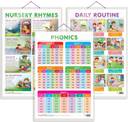 Gowoo presents an educational set of 3 charts: Daily Routine, Nursery Rhymes, and Phonics - 1. Each chart measures 20"X30" inches and is made with non-tearable and waterproof material, ensuring durability. The charts are double-sided laminated, making them perfect for homeschooling or any learning environment. The Daily Routine Chart visually represents a typical day's activities. It includes illustrations and labels for actions such as waking up, eating breakfast, going to school, playing, and going to bed. This chart helps children develop a sense of routine and time management skills while reinforcing vocabulary related to daily activities. The Nursery Rhymes Chart features popular nursery rhymes that are entertaining and educational. It includes well-known rhymes such as "Twinkle, Twinkle, Little Star," "Humpty Dumpty," and "Mary Had a Little Lamb." This chart promotes language development, rhythm, and early literacy skills as children engage with the rhymes and sing along. The Phonics - 1 Chart focuses on building foundational phonetic skills. It covers letter recognition, letter sounds, and basic phonetic patterns. The chart features vibrant visuals and examples to reinforce phonics concepts, helping children develop reading and language skills. These educational charts are visually appealing, non-tearable, waterproof, and double-sided laminated, ensuring longevity and suitability for various learning environments. They are valuable tools for teaching children about daily routines, nursery rhymes, and phonics - 1, fostering routine comprehension, language development, early literacy skills, and phonemic awareness.