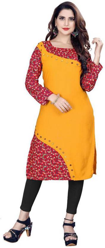 Women Printed Cotton Silk Straight Kurta (Yellow)