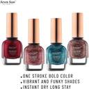 This Nail polish No harmful chemicals of our nail paint used to speed up the drying process. The nail paints have a flat brush for smooth application and perfect intense finish. Our nail paints for women coats your nails to perfection, giving them a vibrant and elegant look which add sparkle to your everyday life.