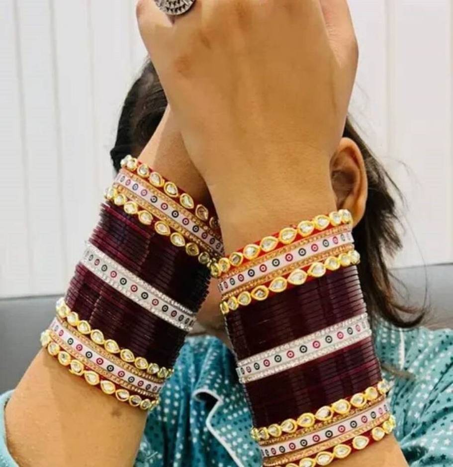 Enhance your bridal and ethnic look with this beautifully designed traditional chooda bangle set. Crafted with elegant detailing and decorative stone work, this set adds a rich and graceful touch to wedding and festive outfits.