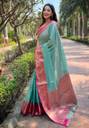 This beautiful Kanjivaram Soft Silk Handloom Heavy Saree. Saree Length:- 5.5 Meter, Blouse Piece Length: 0.8 Meter (Unsticthed, Attached With Saree), Having Gold Zari Decent Woven Border and Crafted with Elegant Zari Woven Pallu.