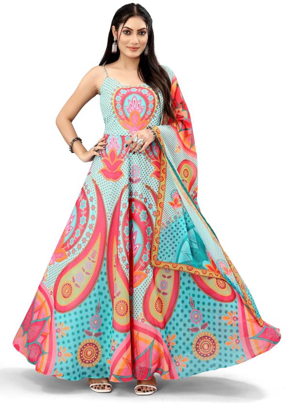 Printed Georgette Stitched Flared/A-line Gown (Light Green)