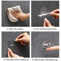Installation is straightforward and requires no tools. To begin, simply clean and dry the wall surface where you want to place the hook. After prepping the area, remove the protective film from the adhesive backing and press the hook firmly against the wall, ensuring any air bubbles are removed. It's best to wait at least 12 hours before hanging items on the hooks to ensure they stick well, giving you reassurance that they will hold securely.