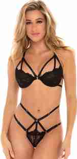 This caged bra includes strap and lace patterns to add dimension and character. The thong ...