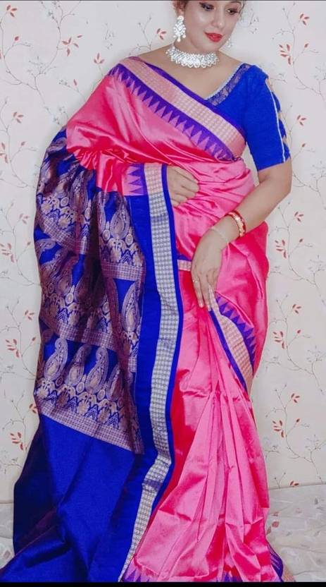 Share Balaji creation Temple Border, Solid/Plain Sambalpuri Silk Blend Saree (Pink)