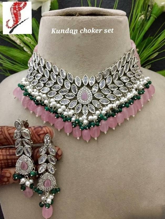 Elegant and attractive, this coloured necklace with earrings, real gold plated pendant on glass base 23 carat gold unique design which add sparkles to your attire. Made of precious metal silver and this kundan choper set make you look unique at weddings, parties and other events. We suggest you to team it with rajputi poshak and saree and other matching jewellery to complete your ethnic look.