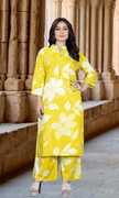 Make a stunning style statement with this beautiful kurta palazzo set crafted from soft and breathable rayon viscose fabric. The kurta features an elegant V-neck design complemented by comfortable 3/4 sleeves, perfect for both casual and ethnic occasions. The striking floral print in white creates a mesmerising contrast against the vibrant yellow background, while the intricate leaf patterns add a touch of sophistication. The palazzo pants provide comfort and style, making this ensemble ideal for various occasions. The set combines traditional aesthetics with contemporary design, suitable for both festive celebrations and everyday wear. The breathable fabric ensures comfort throughout the day, while the relaxed silhouette flatters various body types. Perfect for summer gatherings, casual outings, or office wear, this kurta palazzo set effortlessly bridges the gap between comfort and style.