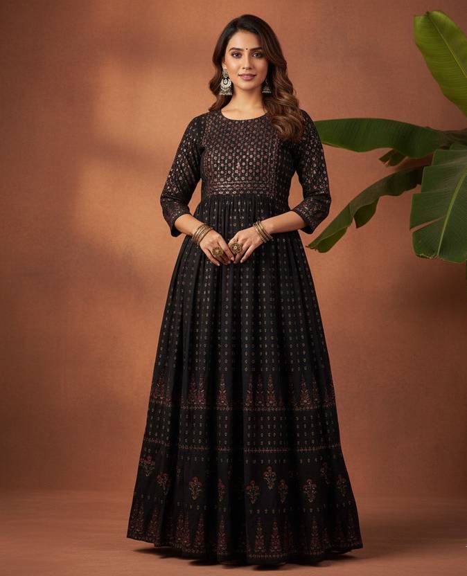 Printed Pure Cotton Stitched Anarkali Gown (Black)
