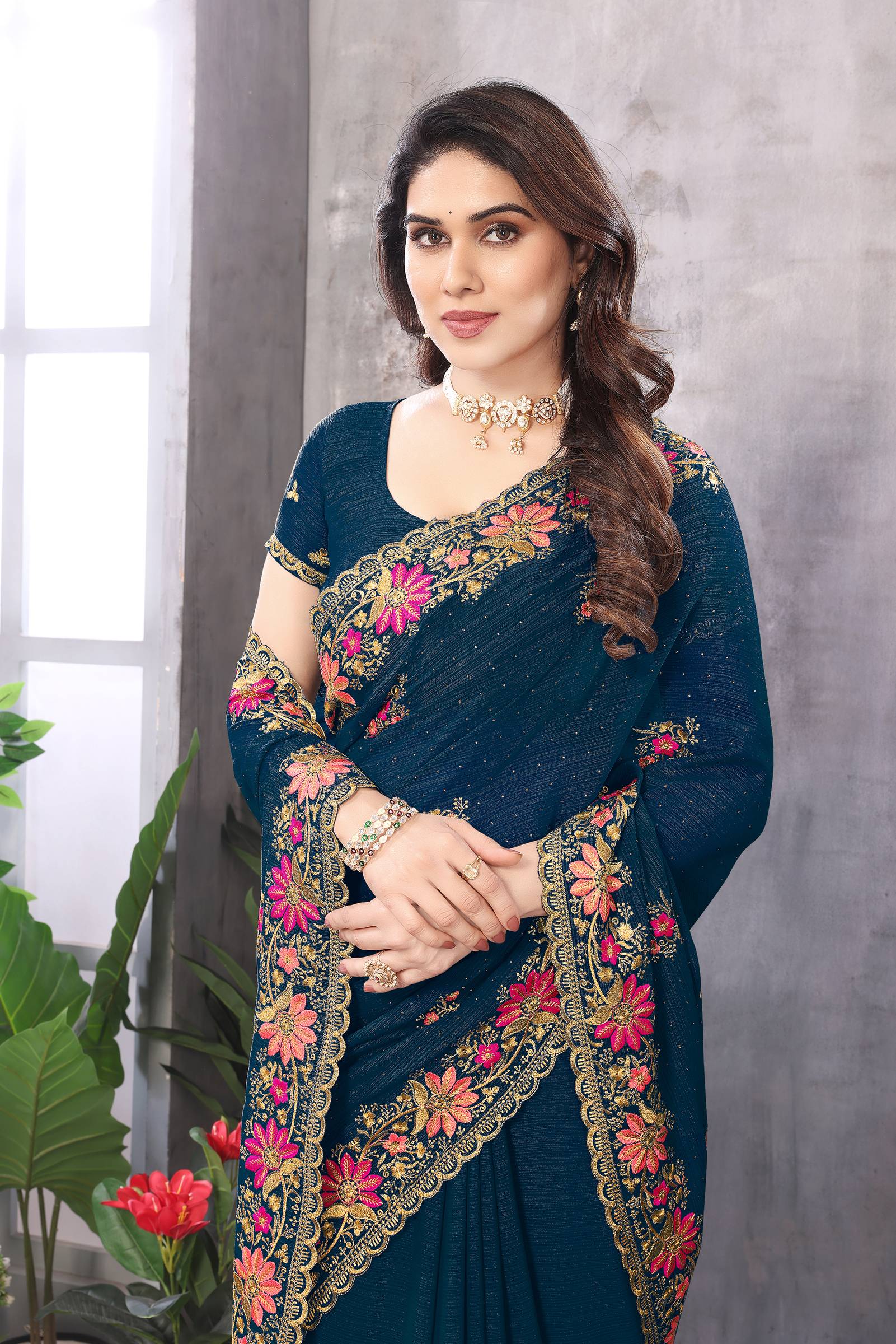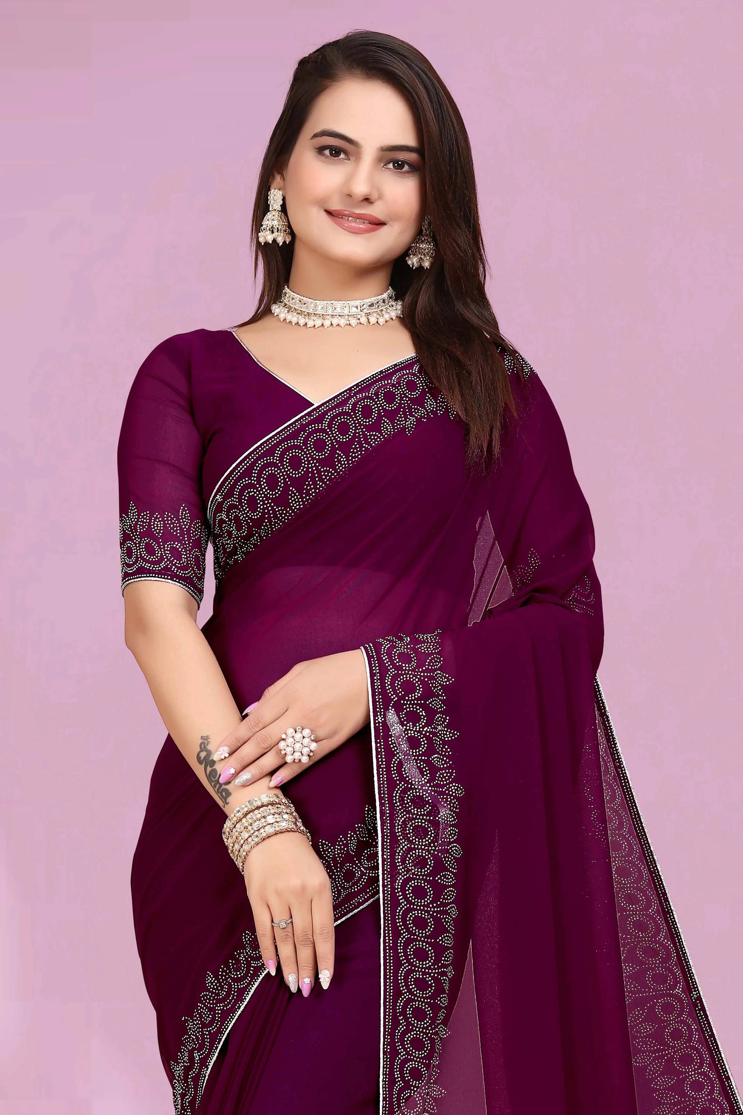 Package Included: - 1 Sari With Matching Blouse Piece Fabric: - This Sari have soft finished Heavy Georgette Fabric easy and Comfortable to wear. Work: - Swarovski Stone Work (Rhinestone) Sari Length: - Sari Length is 5.5 Meter and Blouse Length is 0.80 Meter Occasions: - This Sari is specially design for wedding, Party and Festive Season of Indian women's wear,3D Design Look.