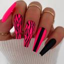 | Series | - This striking and bold nail design features long, coffin-shaped nails. The dominant colors are vibrant neon pink and sophisticated matte black. Two nails are adorned with an eye-catching neon pink base featuring dynamic black zebra stripes, creating a wild and energetic look. Another nail has a neon pink base with two sleek, vertical matte black stripes, offering a modern and graphic element. The remaining nails are solid matte black, providing a chic contrast and grounding the vibrant design.