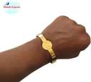 Material: Made from brass with plated with gold, a durable and corrosion-resistant metal., Design: Often adorned with intricate engravings or embossed designs related to Sai Baba's life and teachings., Traditional Style: Usually follows a traditional Indian kada design, with a circular shape and an openable hinge., Symbol of Devotion: Wearing the bracelet is seen as a way to connect with Sai Baba and seek his blessings.