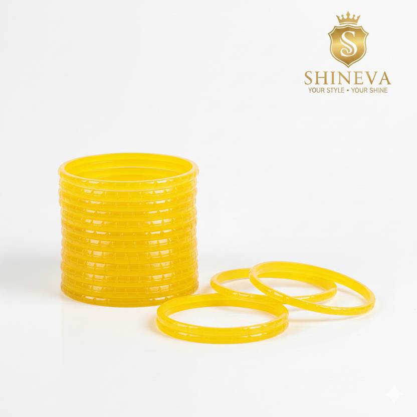Premium quality glossy yellow acrylic bangles with a stylish textured design. Lightweight, durable and comfortable for daily wear. Ideal for festive occasions, traditional outfits and gifting. Pack of 12 bangles in standard size.