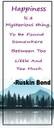 A Collection Of Ruskin Bond Quotes Bookmarks Quotes : "For every time I see thesky, I'm aware of belonging to the Universe than to just one corner of the Earth." "Happiness is a mysterious thing, to be found somewhere between too little and too much." "My inspiration comes from the natural world around me, from he mountains, the trees, the forests, rivers and streams." “On books and friends I spend my money; For stones and bricks I haven't any.”