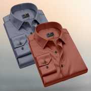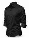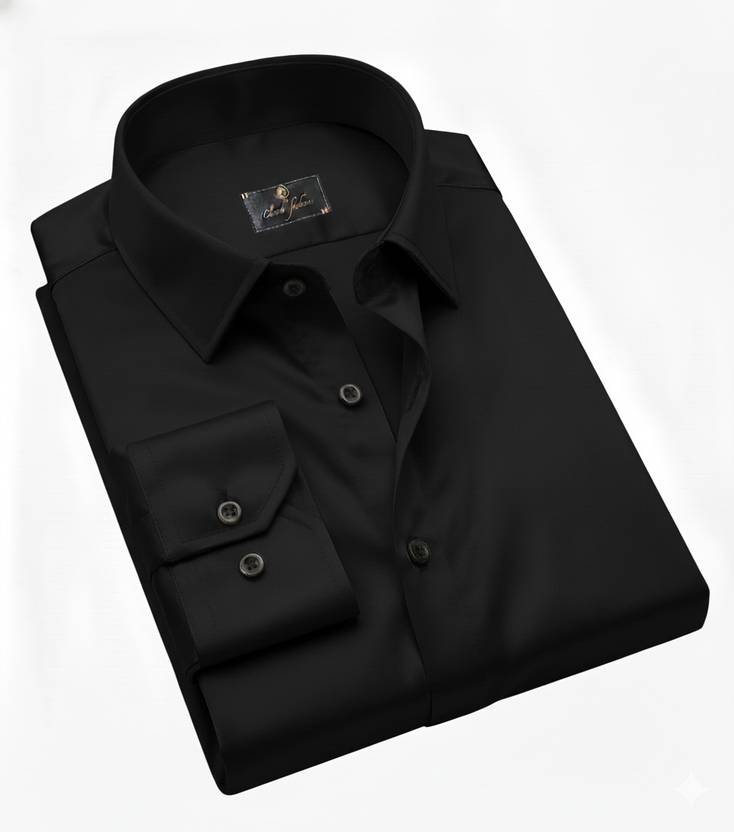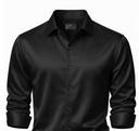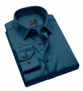 This is a men's solid navy blue long-sleeved shirt featuring a classic collar and dark buttons. The fabric has a smooth texture with a subtle sheen, suggesting a satin or silk-blend material. The sleeves are designed to be rolled up, adding to its versatile style. The shirt has a tailored fit and a curved hem. It can be paired with formal trousers for a sophisticated look or with chinos for a smart-casual ensemble.
