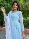 This pastel blue Anarkali kurta set is a blend of elegance and charm. Pair it with silver statement earrings, embellished juttis, and a delicate clutch for a refined festive look. For a more contemporary touch, you can drape the dupatta in a stylish way or accessorize with a waist belt. Perfect for weddings, festive gatherings, and family celebrations, this outfit ensures you stand out with grace and sophistication.