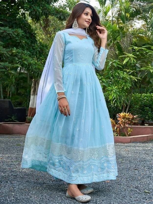 Step into elegance with this light blue Anarkali kurta set, beautifully designed with delicate embroidery and sheer long sleeves. The flowy flared silhouette adds grace, while the intricate hemline detailing enhances the ethnic charm. Paired with a matching dupatta, this outfit is perfect for festive occasions, weddings, parties, and family gatherings. Style it with statement earrings and traditional juttis for a complete ethnic look.