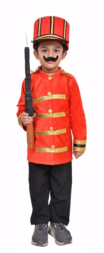 DESIGN FEATURES: Bright red jacket with golden striped embellishments, decorative buttons, and military-style epaulettes for a classic British army look