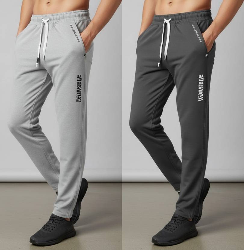 These men's track pants are designed for comfort and style, perfect for active wear or casual lounging. They feature an elastic waistband with an adjustable drawstring for a secure fit. The track pants come with convenient side zipper pockets, ensuring your essentials are safe. Stylish typography details, including 'EVERYDAY' on one leg and '24/7' near a pocket, add a modern touch. The tapered fit provides a contemporary silhouette. Available in versatile solid colors like dark grey and light grey, these track pants are easy to pair with a variety of tops. Compatible products include: T-shirts, Hoodies, Sweatshirts, Sports shoes, Casual sneakers, Tank tops, Polo shirts, Casual jackets.