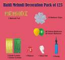 1 pc mehndi foil balloon, 3 pc curtain, 100 pc balloon, 1 PC GLUE DOT, 1 PC RIBBON, 1 PC BALLON PUMP, 15 PC FLOWER CLIP