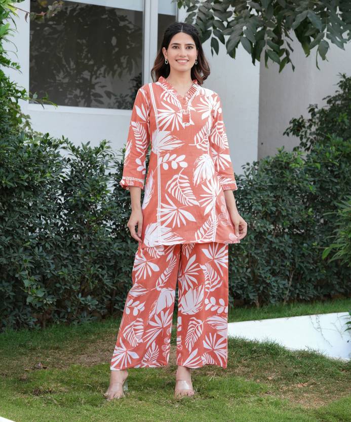 This cotton co-ord set is a stylish and comfortable ensemble, perfect for casual and summer wear. The set features a soft, breathable fabric in a warm terracotta shade with bold white tropical leaf prints, creating a vibrant yet relaxed look.The top is a short kurta-style tunic with three-quarter sleeves, a V-neckline with subtle embroidery detailing, and a straight-cut silhouette that enhances its effortless charm. The matching wide-leg pants offer a breezy fit, making the outfit ideal for warm weather.Paired with transparent block heels and minimal jewelry, this co-ord set is a perfect choice for vacations, brunch outings, or daily casual wear.