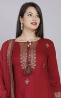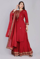 Featuring an intricately embellished, embroidered pattern, this women's kurta, palazzo, and dupatta set showcases an attractive design that adds a touch of elegance to your wardrobe. The detailed embroidery, which adorns the kurta, highlights artisanal craftsmanship and creates a sophisticated appearance. The design elements are thoughtfully placed to enhance the overall aesthetic of the outfit, making it a standout choice for various occasions.