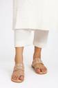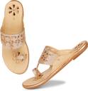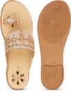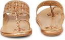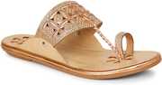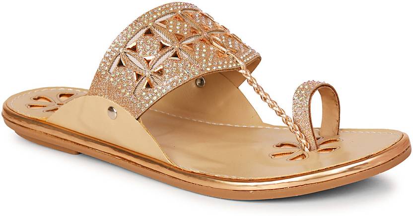 Step into elegance with these exquisite Shoegazing flat Kolhapuri chappals for women. Featuring a stunning honeycomb mesh pattern adorned with glittering embellishments, these sandals showcase beautiful floral cutwork detailing and a delicate chain accent. The sophisticated rose gold tone adds a touch of glamour to any outfit. The thoughtfully designed padded insole ensures day-long comfort, while the slip-resistant resin outsole provides reliable stability. Perfect for festive occasions, daily wear, or special events, these versatile flats effortlessly blend traditional charm with contemporary style. The lightweight construction makes them ideal for extended wear, whether you're shopping, working, or attending social gatherings. The premium quality craftsmanship is evident in every detail, from the precise stitching to the durable sole pattern. These flats are available in multiple sizes - we recommend consulting the size chart for the perfect fit. Match them with traditional or western attire for a fashionable look that doesn't compromise on comfort.