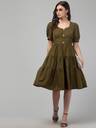 Shonisha Cotton Blend Sweetheart Neck Knee-Length Puff Sleeves Fit and Flare Dress is a charming and versatile piece that effortlessly combines romantic details with comfort. The sweetheart neckline adds a touch of femininity and elegance, creating a flattering frame for the upper body. Crafted from a comfortable cotton blend, the dress ensures breathability and ease of movement, making it suitable for various occasions.The knee-length hem strikes a balance between modesty and style, making it a perfect choice for both casual and semi-formal events. The puff sleeves add a playful and trendy element to the dress, enhancing its overall charm. The fit and flare silhouette cinch at the waist before gracefully flowing out, creating a timeless and flattering shape.Whether you're heading to a brunch, a garden party, or a casual evening outing, the Cotton Blend Sweetheart Neck Knee-Length Puff Sleeves Fit and Flare Dress is designed to make you feel both comfortable and effortlessly chic.