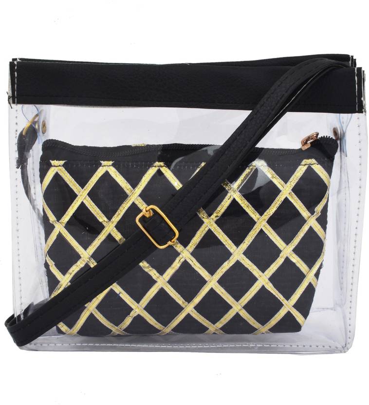 This Sling Bag is made by SHOOPS Brand . Stylish and durable for modern Girls/Women is this Black colored Sling Bag . It is very convenient to carry for casual or party purpose . It contains a transparent outer bag and a checked pattern inner bag giving it a cute yet casual finish .The transparent Outer bag has a Magnetic Button closure , while the Inner bag has a Zipper closure . It features a non-detachable adjustable strap to carry it . Its made from premium leatherette PU and synthetic material which makes the bag sturdy and durable . Great for carrying your essential stuff with no worries of the bag getting damaged .