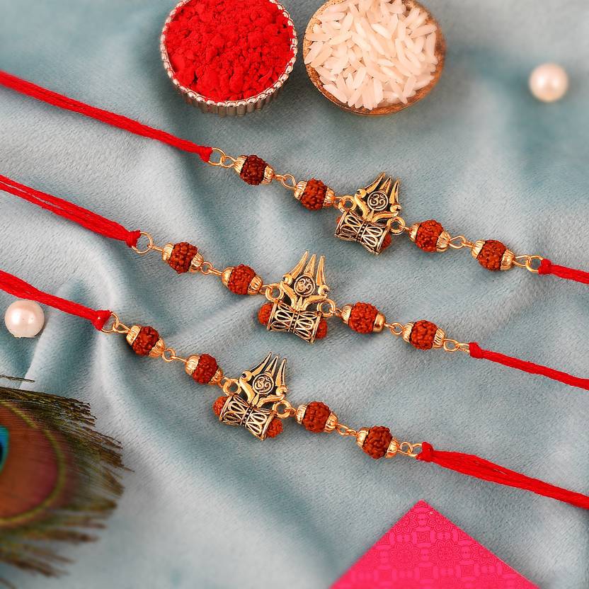 3Rudraksh Trishul Bhai Rakhi, 1Greeting Card For Brother + RoliTikka Chawal